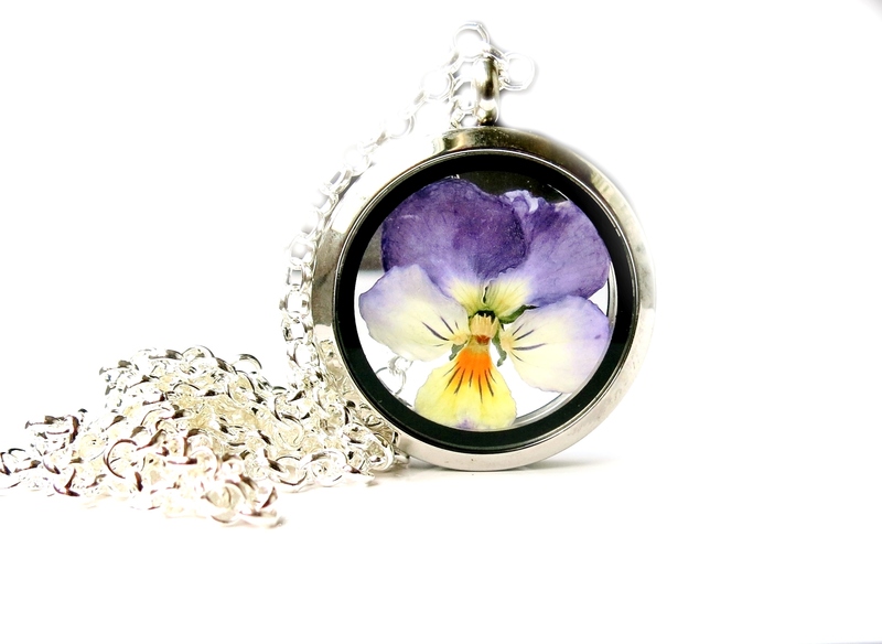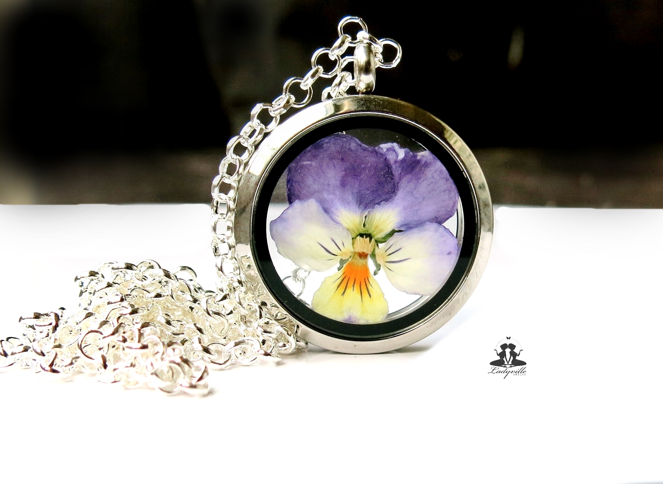 Wunderschöne Kette mit einem Glasmedaillon und Hornveilchen, der kleinen Schwester vom Stiefmütterchen.