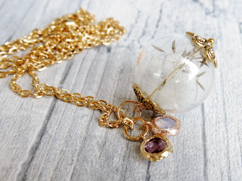 Wundervolle Kette mit vielen echten getrockneten Pusteblumen in einer Glaskugel für die Ewigkeit festgehalten und mit zwei Kristallen in flieder und rosa verschönt.