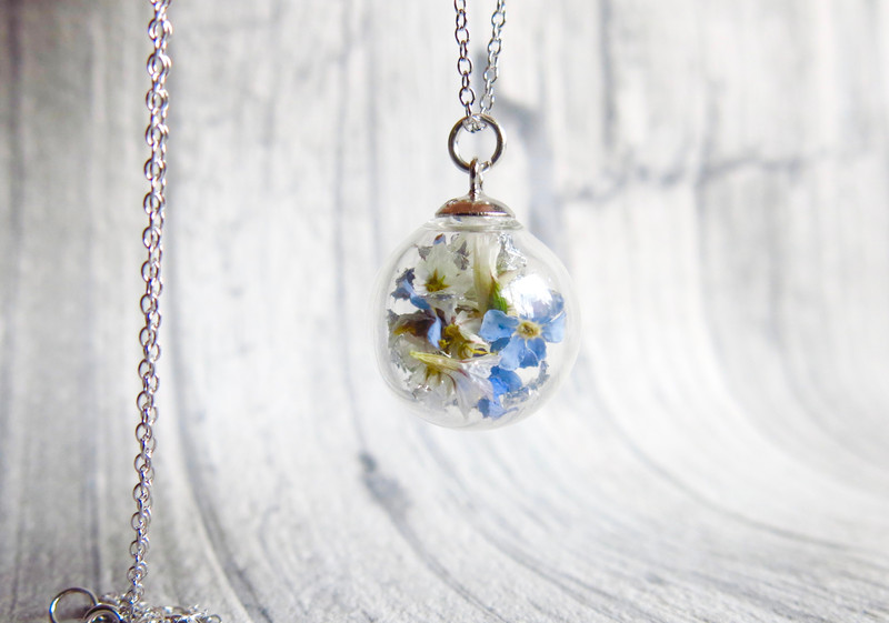 Bitte beim Duschen, Baden etc. abnehmen, die getrockneten Blumen /Blüten können Schaden davon tragen, wenn Wasser in die Glasperle eindringt. Da es sich um ein Naturprodukt handelt, sieht jede Füllung etwas anders aus.
