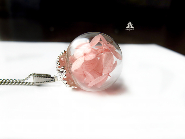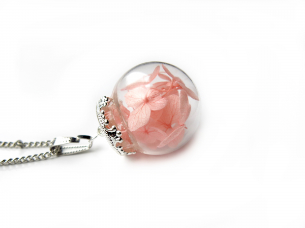 Feine silberfarbene Kappe schützt eine mundgeblasene Glasperle mit vielen konservierten Hortensienblüten in zart rose.