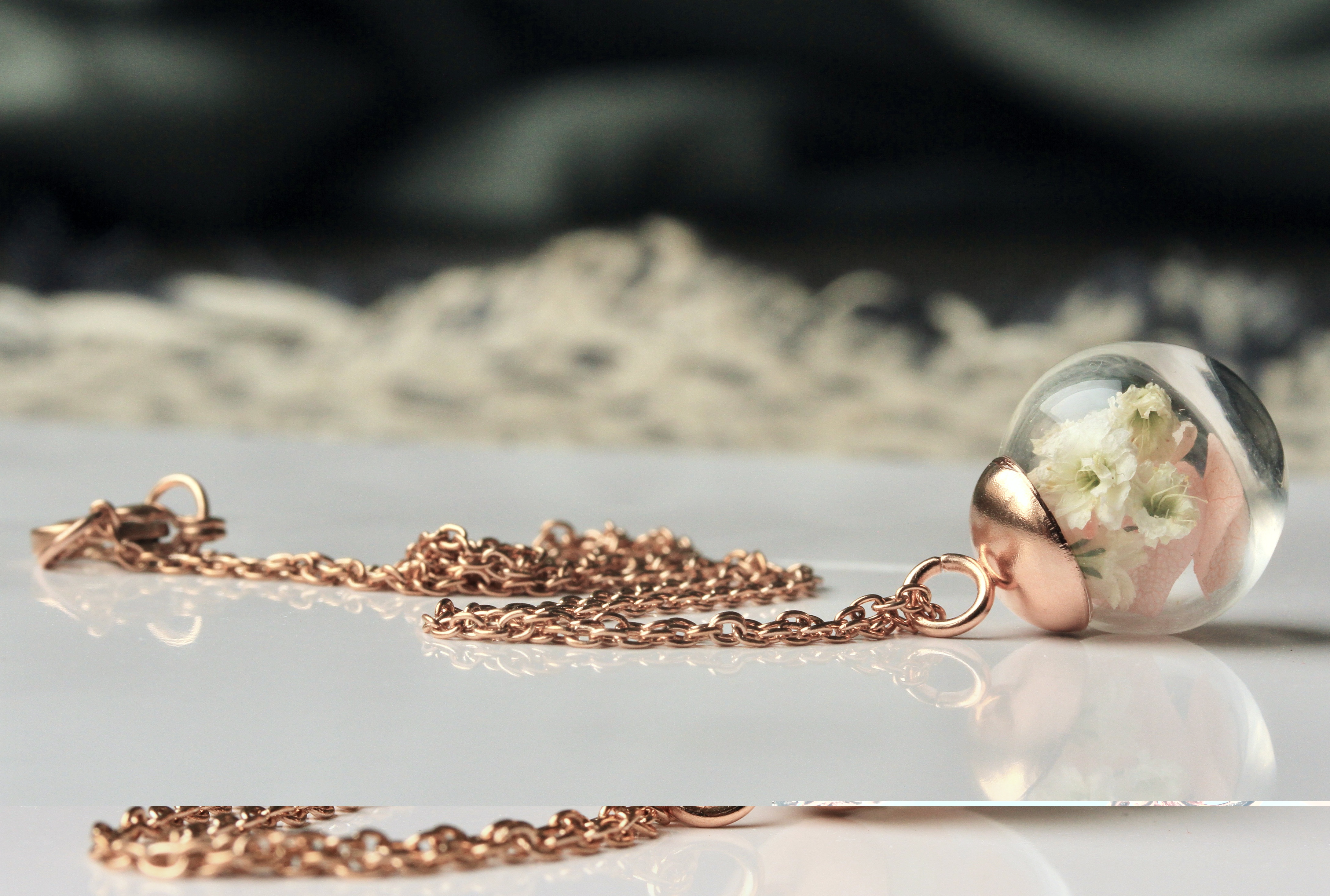 Wunderschöne rosegoldfarbene Kette mit einem runden Anhänger aus Glas, bestückt mit vielen kleinen rosa Blütenblätter der Hortensie und weißen Schleierkraut und zum Schmuckstück verarbeitet.