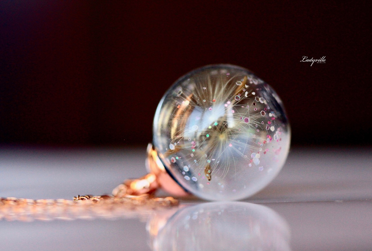 Bitte beim Duschen, Baden etc. abnehmen, die getrockneten Pusteblumen können Schaden davon tragen, wenn Wasser in die Glasperle eindringt.