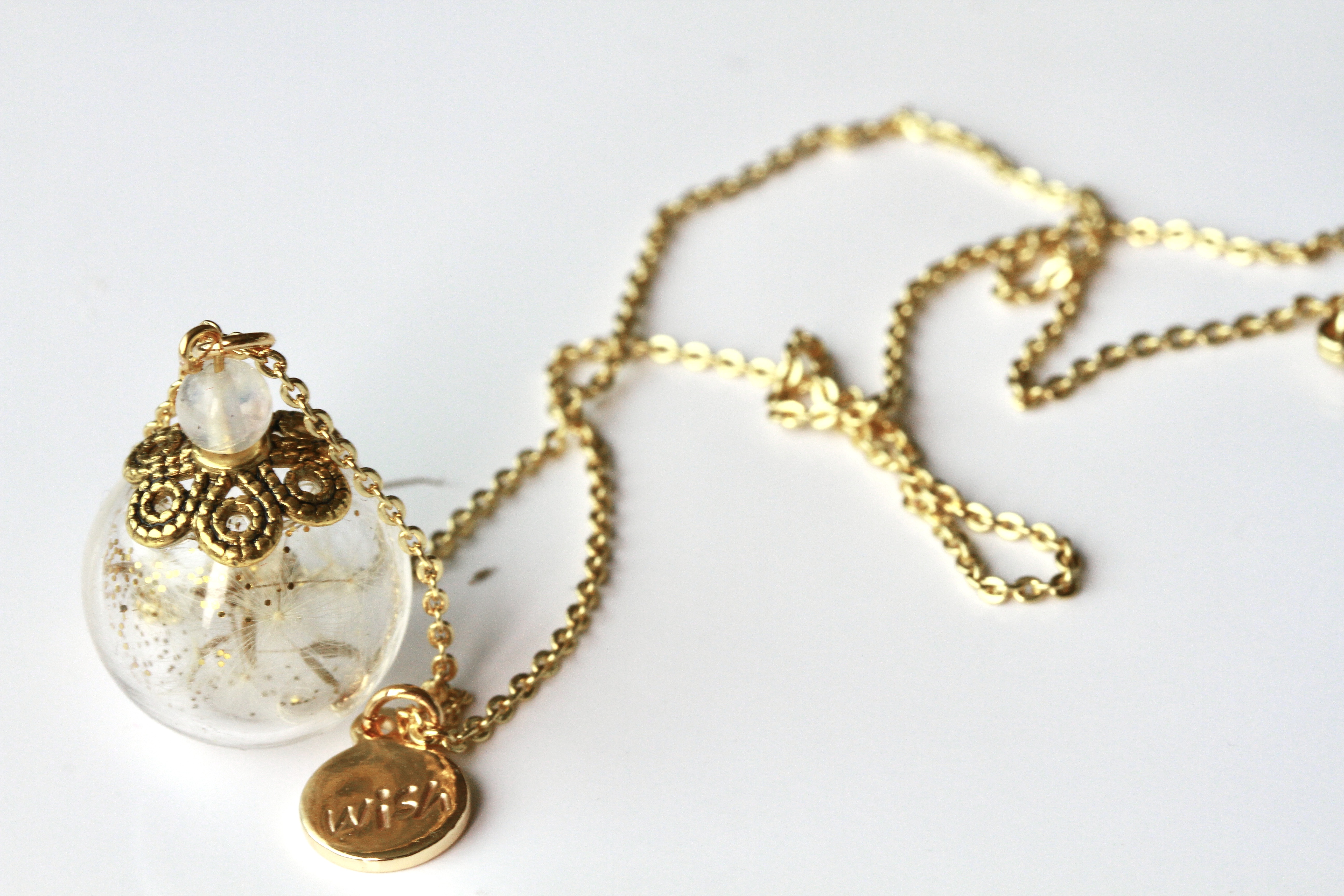 An einer feinen vergoldeten Kette aus Sterling Silber baumelt deine persönliche Wunschkugel aus Glas mit Pusteblumen, die mit einer Mondsteinperle und goldenen "Feenstaub" verschönt wurde. Daneben hängt eine echt vergoldete per Hand bestempelte Scheibe mit dem Wort: wish. Denn im Volksmund sagt man der Pusteblume nach, dass sie Wünsche erfüllen kann.
