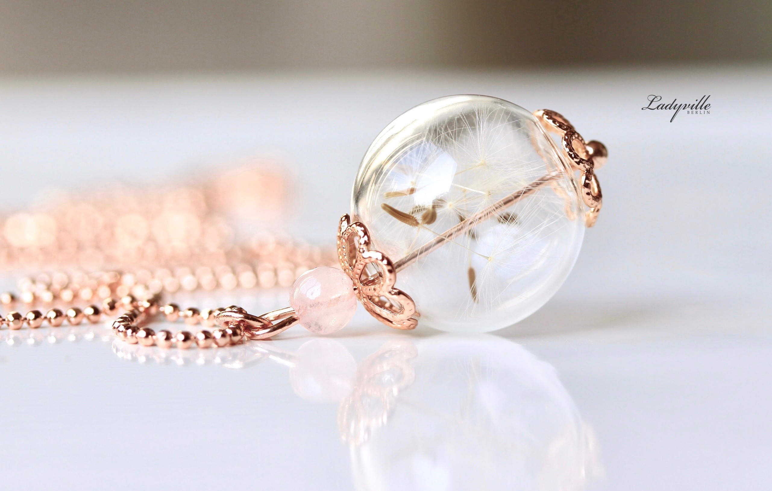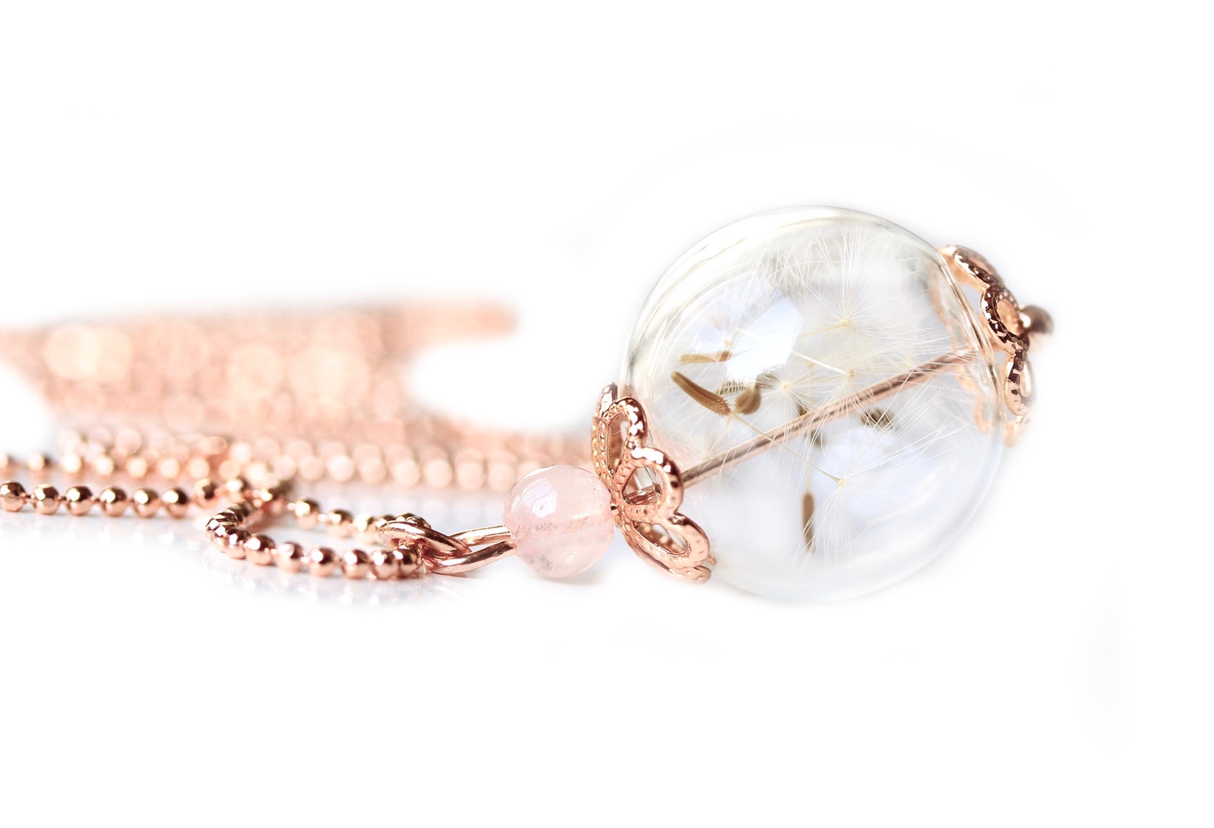 Roségoldfarbene Kugel Kette - Pusteblume in Glaskugel mit Rosenquarz / Geschenk für Sie / wünsch dir was / Glück Kette / beste Freundin