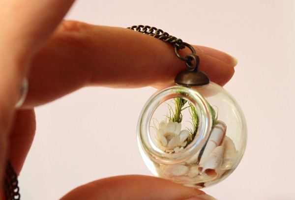 Wie ein kleines Stück Waldboden kommt diese wunderschöne Kette daher. Mit vielen kleinen Kieselsteinhen, grünen Moos, Baumrinde von einer Birke und einer weißen Blüte. Der Boden ist fein in Harz gegossen und somit ist alles fixiert und zum Schmuckstück geeignet. Die Glaskugel hat ein Bullauge und wirkt somit wie ein geheimer Garten, den man von außen betrachten kann. Die Kette macht richtig Lust auf den nächsten Spaziergang in der Natur.