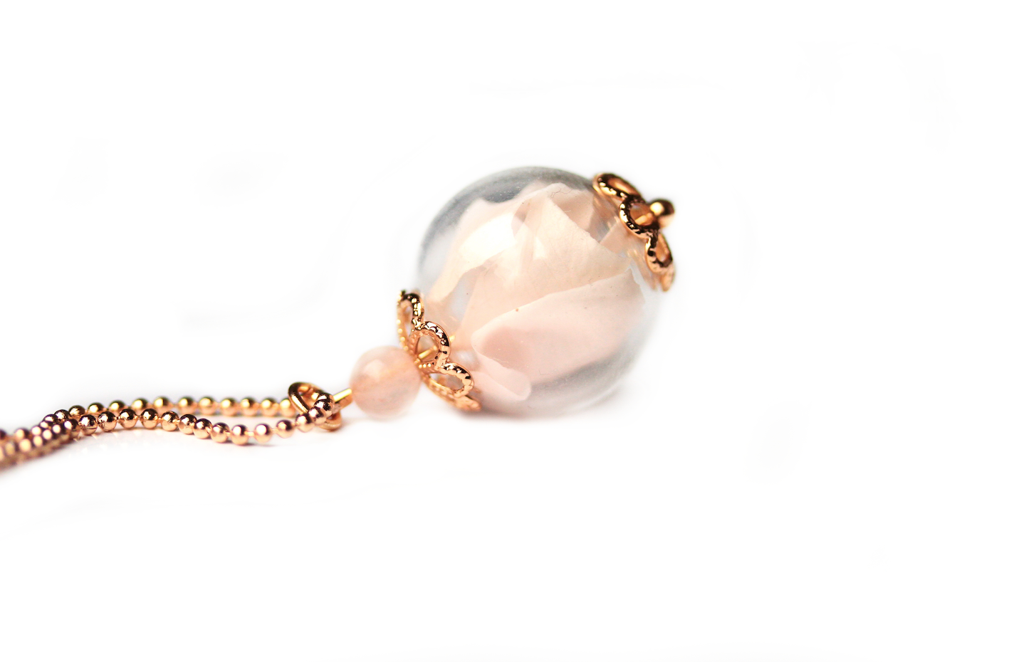 Roségoldfarbene Kugelkette mit konservierten rosefarbenen Blütenblätter in einer Glaskugel für die Ewigkeit festgehalten und mit Perlenkappen und einer Rosenquarzperle verschönt.