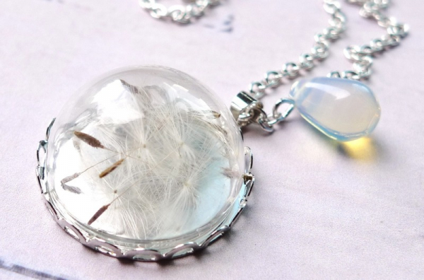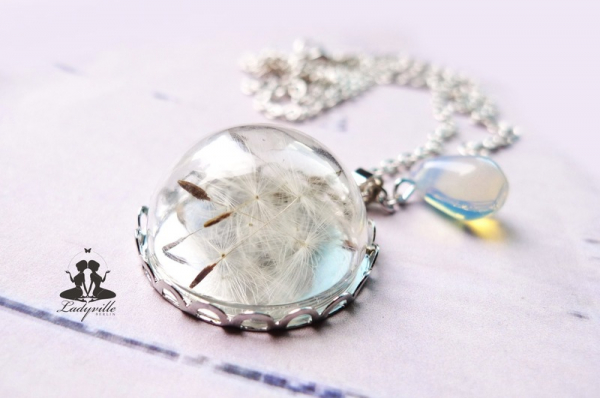 Zum verlieben schön - und nur bei Ladyville erhältlich: Eine große mundgeblasene Glaskuppel mit silberfarbener Fassung schützt ein paar zarte Pusteblumensamen. Dazu gesellt sich ein polierter Opalitetropfen. Das Gesamtkunstwerk hängt an einer langen Giederkette und wartet darauf, ausgeführt zu werden und Wünsche zu erfüllen.