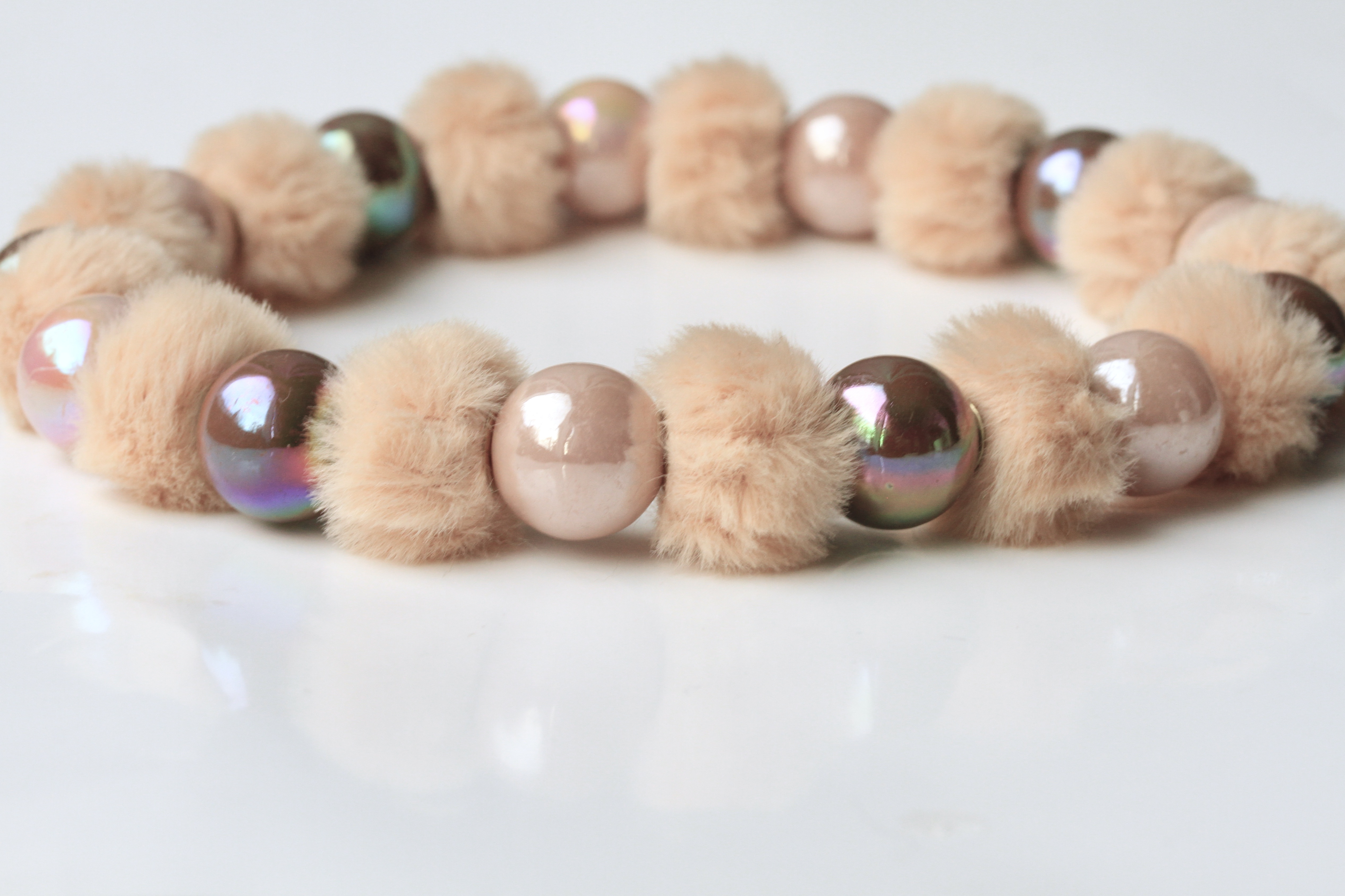 Die runden Perlen sind aus aus irrisierenden Acryl (15mm) und die Rondelle (20mm) sind mit beigefarbenen plüschigen Fell überzogen (künstlich, nicht tierischen Ursprungs).