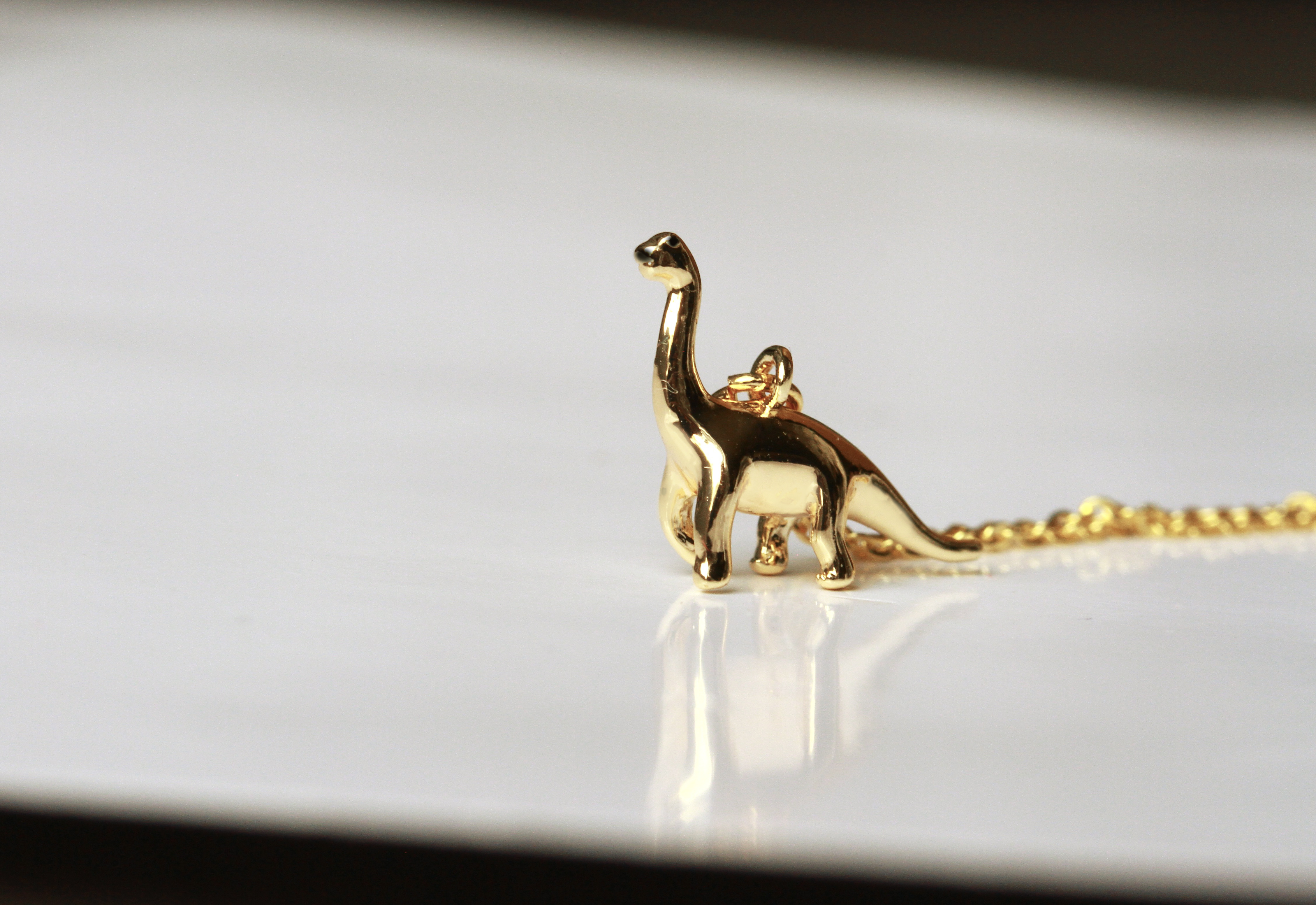 An einer vergoldeten Sterling Silber Kette baumelt ein kleiner niedlicher vergoldeter Dinosaurier aus Messing. Die Augen und Nase haben wir schwarz emailliert. Wir schneiden und montieren unsere Ketten selbst. Falls ein anderes Material oder Länge gewünscht ist, einfach vorab unverbindlich anschreiben.
