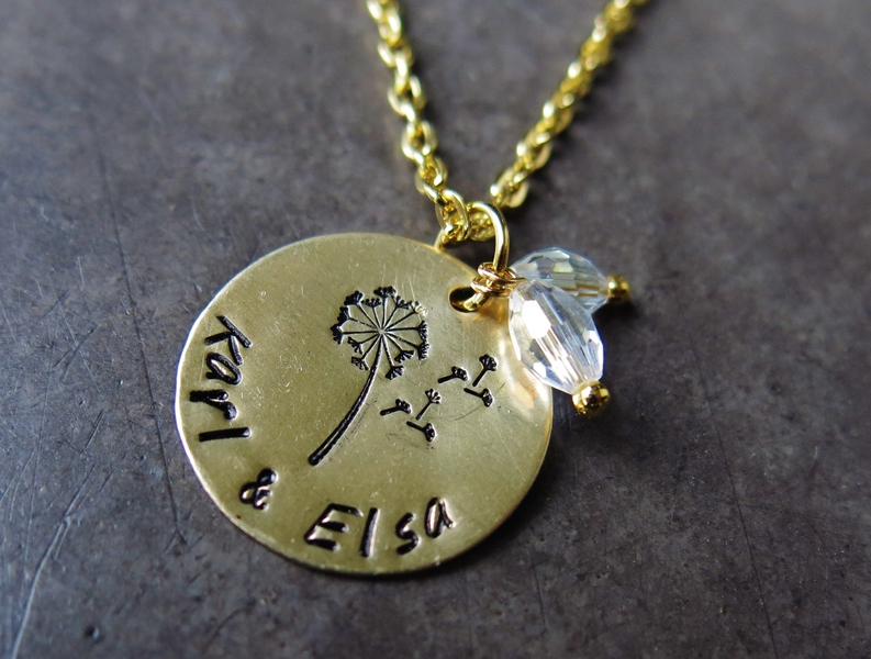 An einer feinen Gliederkette hängt eine von Hand gestempelte Scheibe mit ein paar verwehten PusteblumenSamen und deinen Wunschnamen/Wunschworten. Dazu gesellen sich zwei durchsichtige Kristalle.