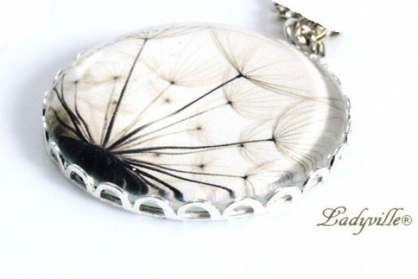 Traumschöner silberfarbener Anhänger mit bezaubernder Pusteblume in der Abenddämmerung, eingebettet in einem Glascabochon baumelt an einer langen silberfarbenen Kugelkette.
