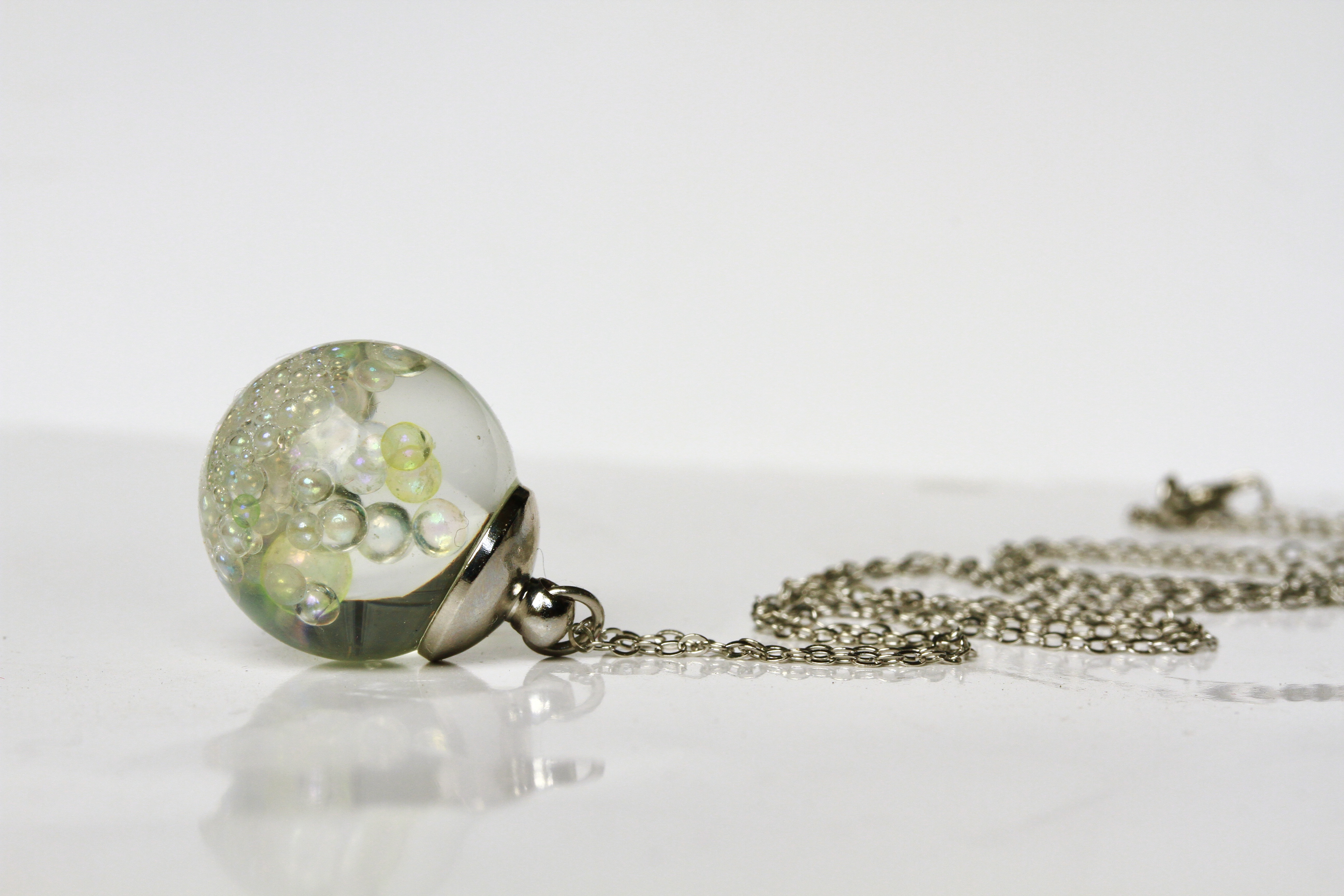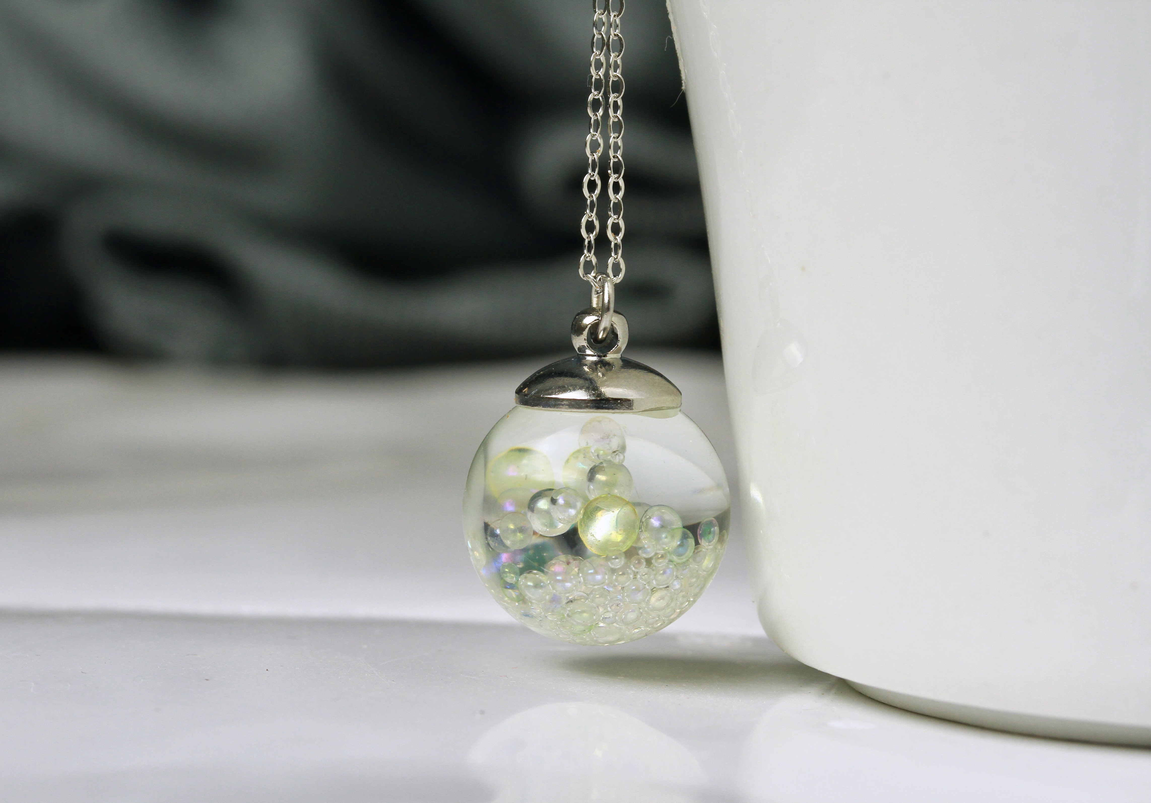 Wundervolle Kette mit vielen unterschiedlich großen hohlen Glasperlen, die aussehen wie Seifenblasen, die je nach Lichteinfall in verschiedene Farben leuchten, in einer Glaskugel vereint und in Gießharz fixiert.