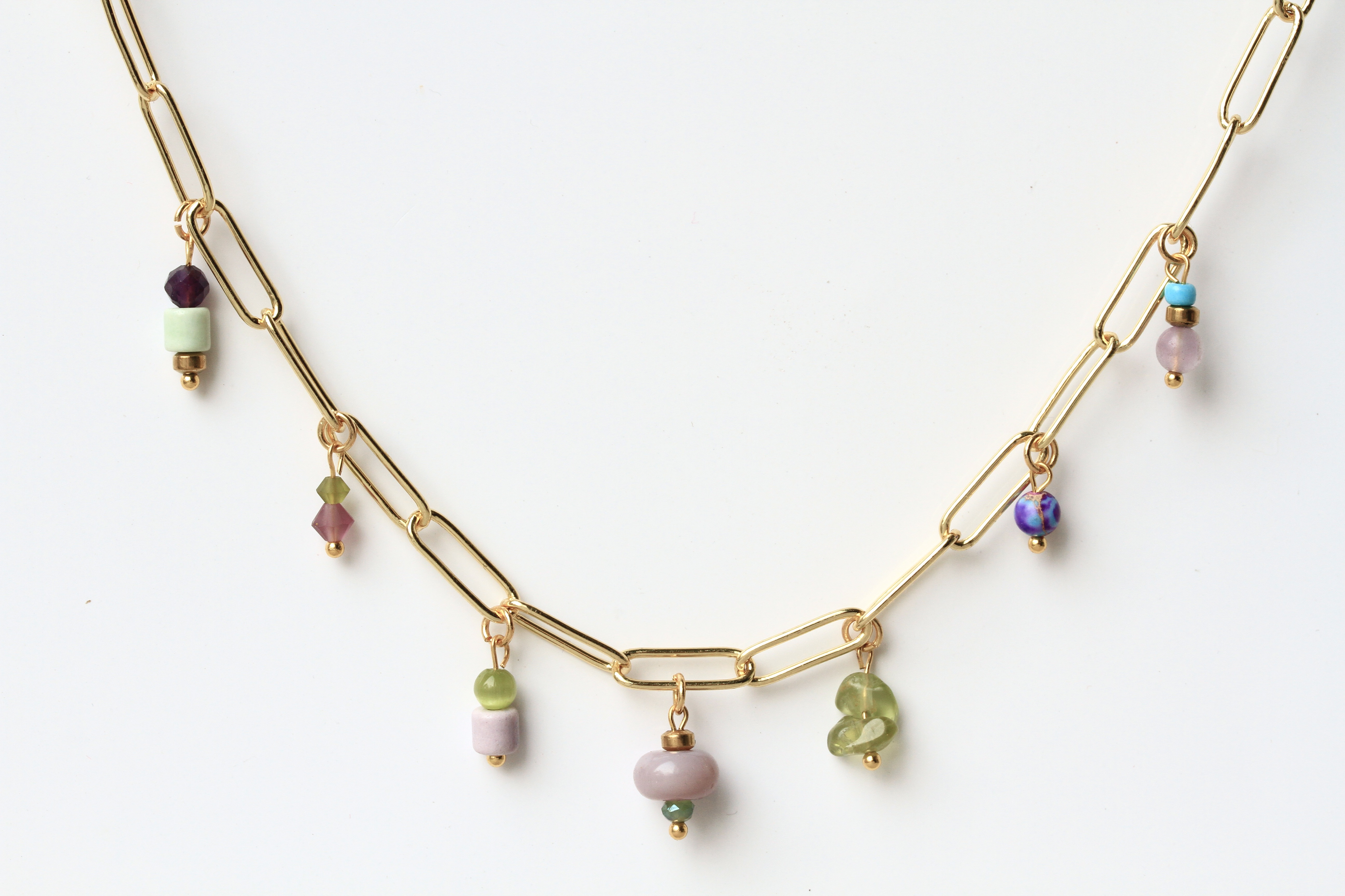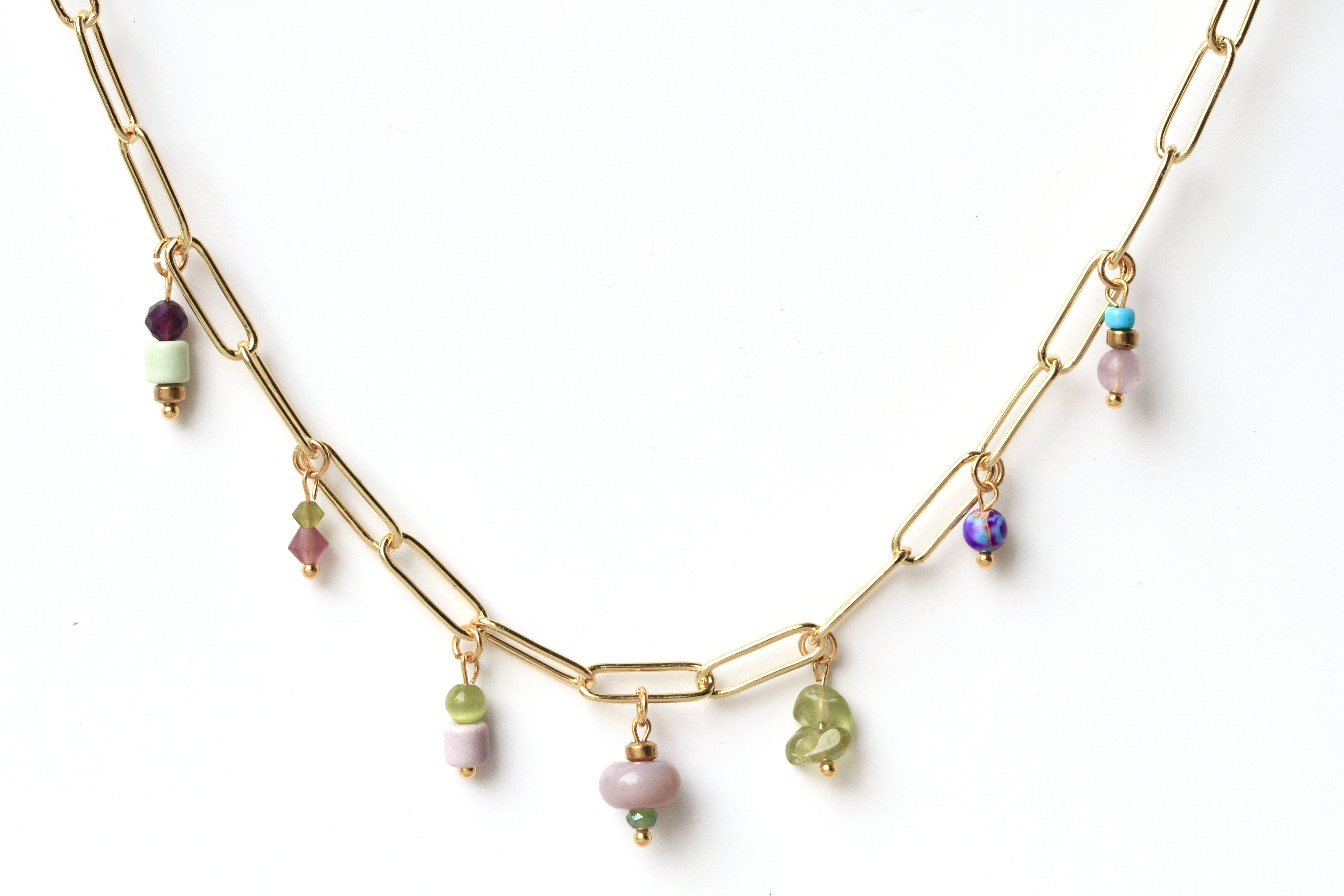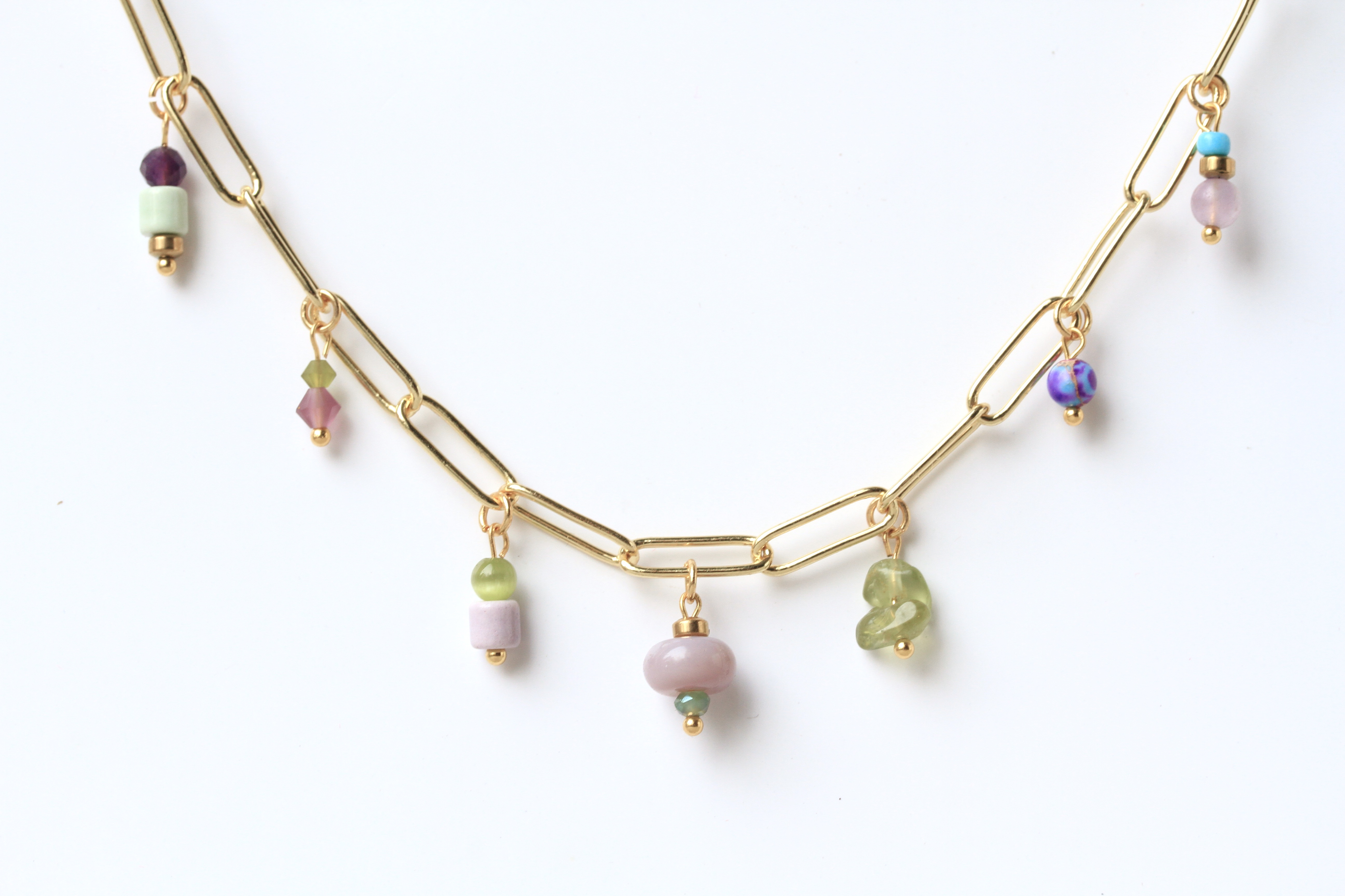 Bezaubernde Multi Charms Halsketten mit einer ausgewählten Mischung aus böhmischen Glasperlen und Edelsteinen wie Amethyst, Jade, Peridot und vergoldeten Elementen.
