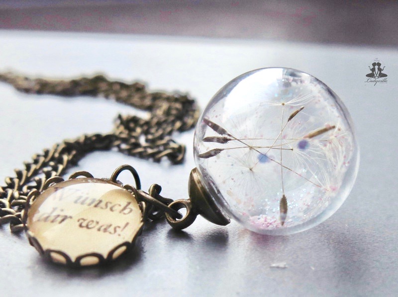 Bitte beim Duschen, Baden etc. abnehmen, die getrockneten Pusteblumen können Schaden davon tragen, wenn Wasser in die Glasperle eindringt.