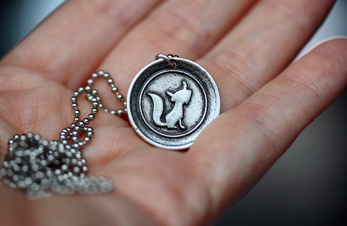 An einer langen Kugelkette hängt eine geprägte Scheibe mit einem kleinen Waldbewohner, dem Fuchs.