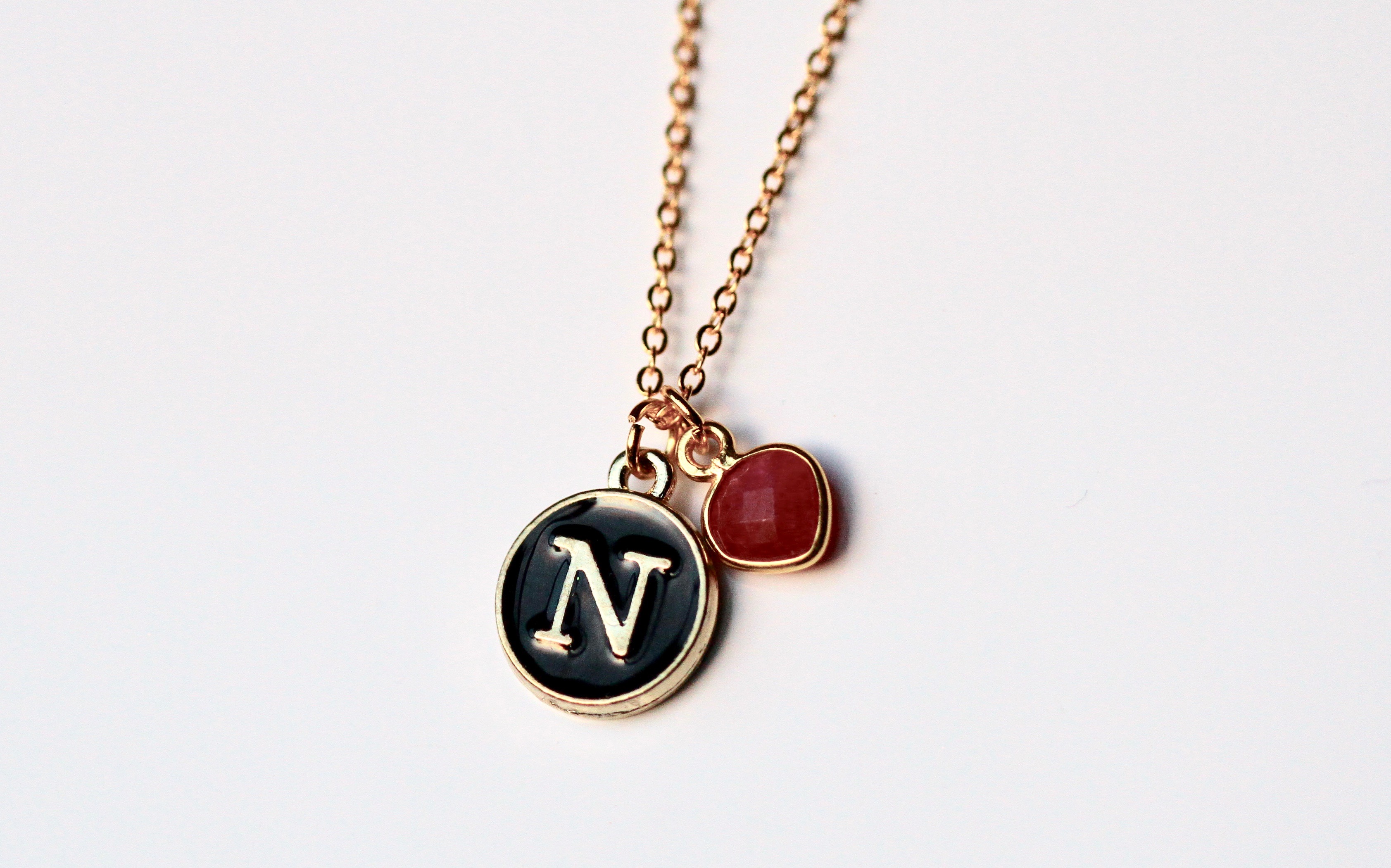 Individuelle Kette aus vergoldeten Sterling Silber mit einer schwarz emaillierten Initial Scheibe und deinem persönlichen Wunschedelstein, gedacht als Geburtsstein.