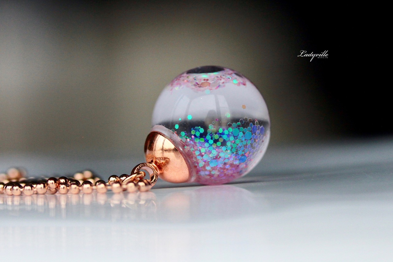 Wundervolle roségoldfarbene Kette mit rosafarbenen Regenbogen Glitzer und spezieller Lösung auf Wasserbasis in einer Glaskugel vereint.