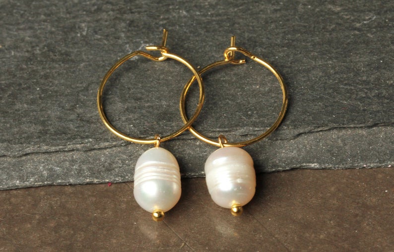 An kleinen Creolen aus Edelstahl baumelt jeweils eine feine natürliche Süßwasserperle.