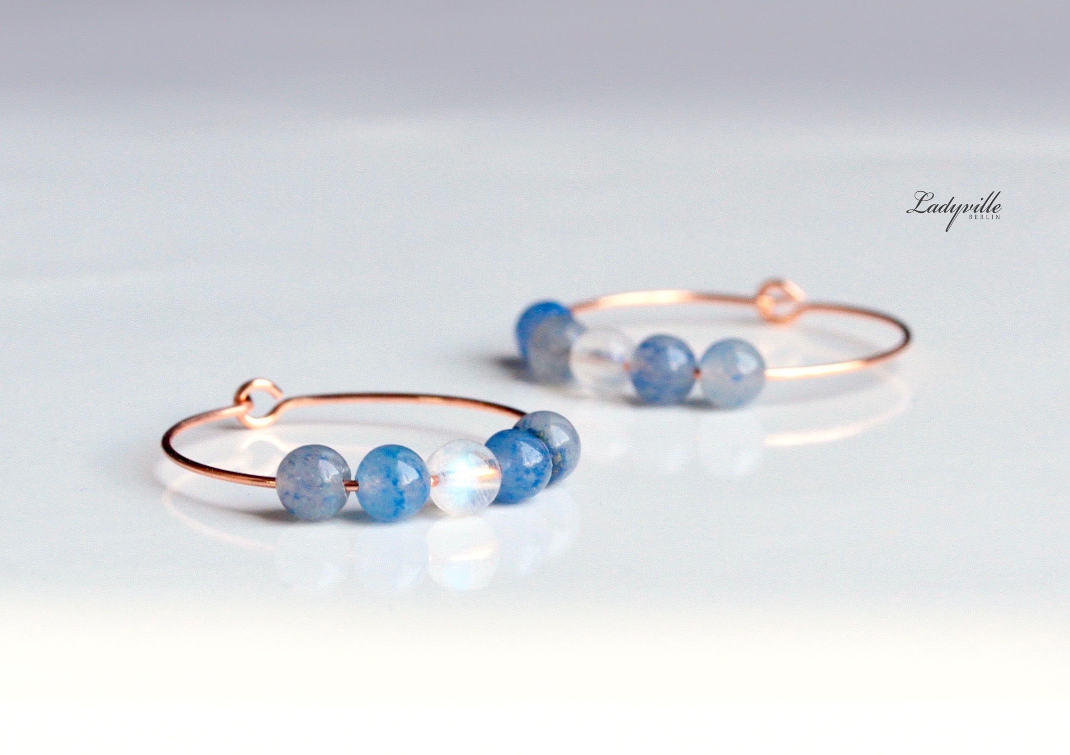Glänzende Creolen aus robusten Edelstahl, rosegoldfarben und mit polierten Perlen aus Aventurin und einem facettierten Aquamarin verschönt.