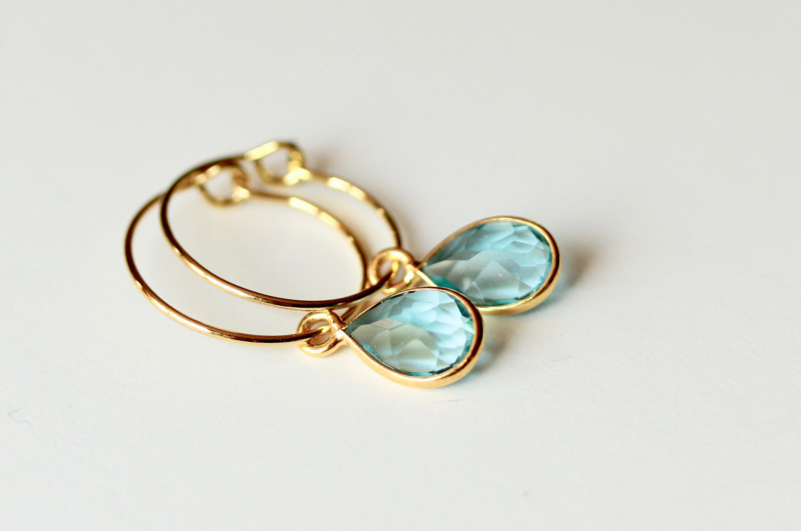 An echt vergoldeten kleinen Creolen baumelt jeweils in einer handgefertigten Fassung, ein fein facettierter blauer Topas.