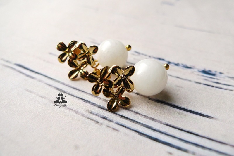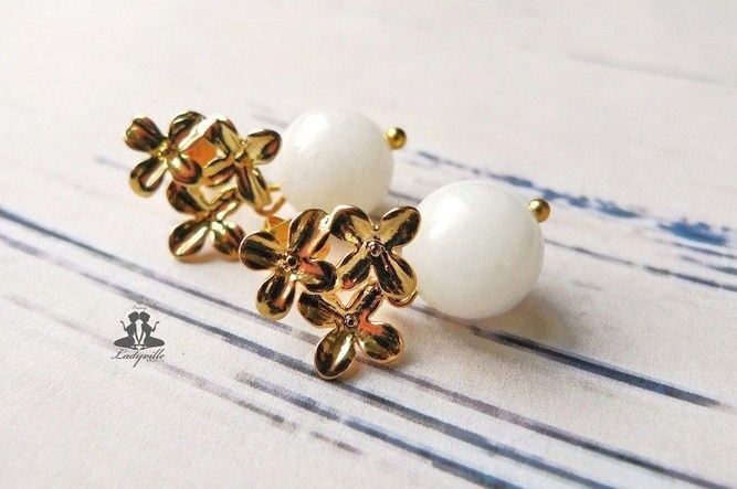 An schlichten Ohrhaken aus vergoldeten Sterling Silber baumelt je ein polierte weiße JadePerle mit feinem Blümchen aus goldfarbenen Messing.