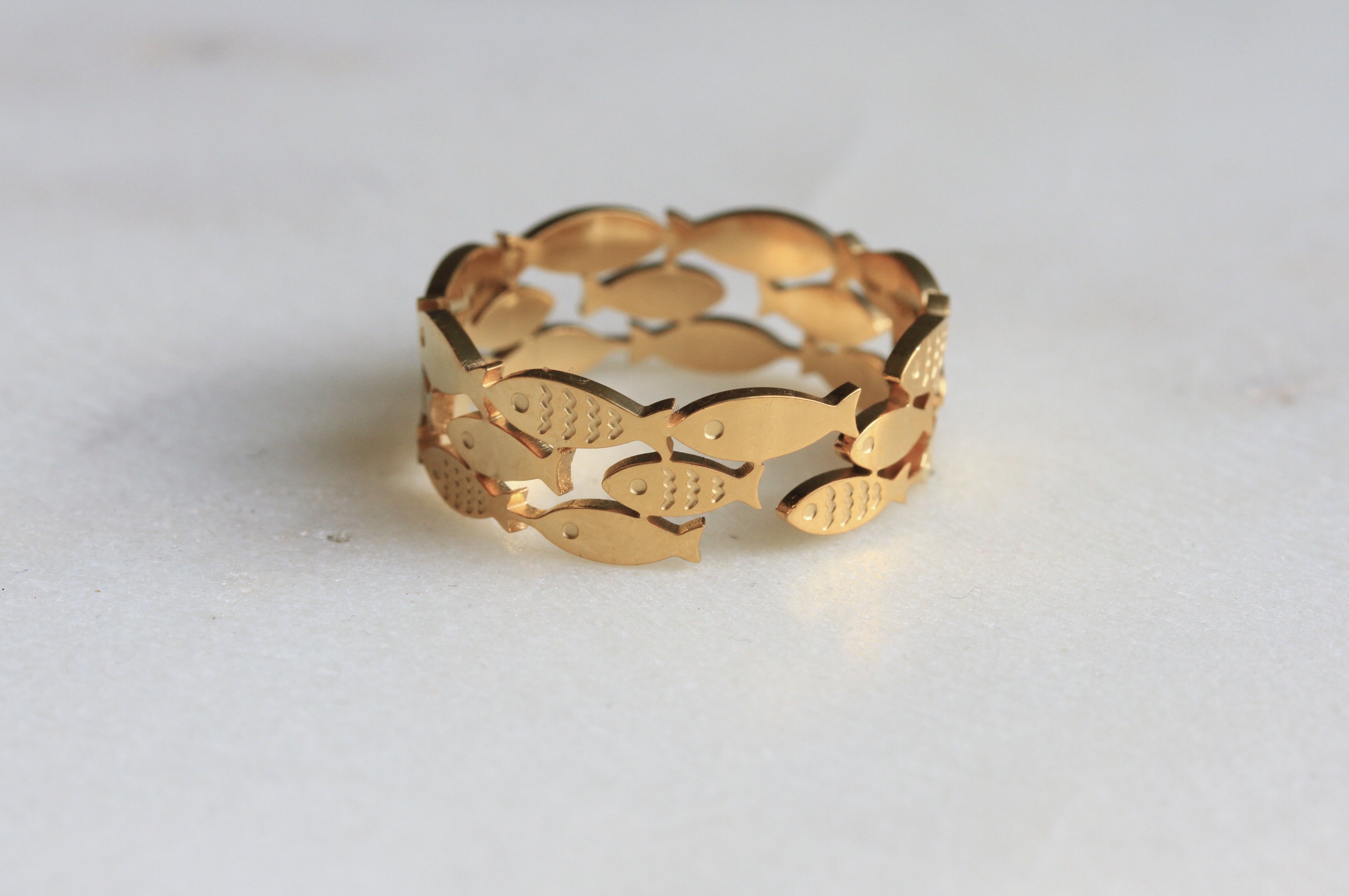 Feiner Ring aus echt vergoldeten Edelstahl mit einem fein ausgebarbeiteten Fischschwarm.