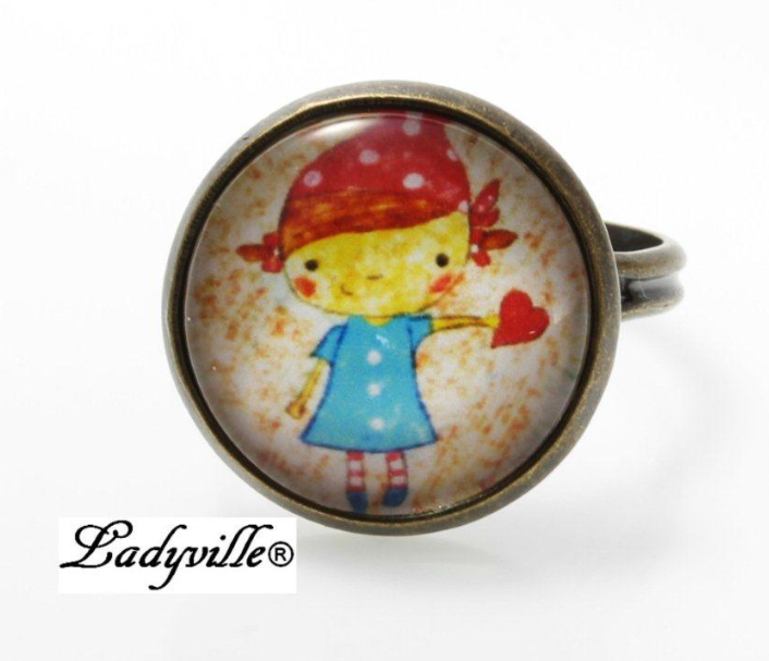 Bronzefarbener Ring aus dem Hause Ladyville, mit einem herzigen Fräulein, unter einer Glaskuppel.