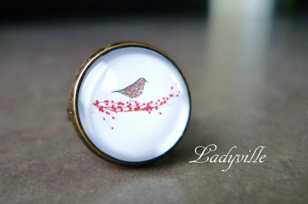 Bronzefarbener Ring aus der Grafikabteilung von Ladyville, mit einem feinen Vögelchen mit Beerenzweig, unter einer Glaskuppel.