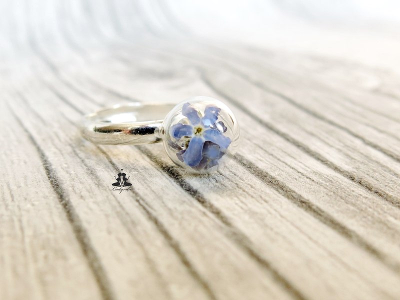 Wundervoller silberfarbener Ring mit ein paar zarten getrockneten Vergissmeinnicht Blüten.