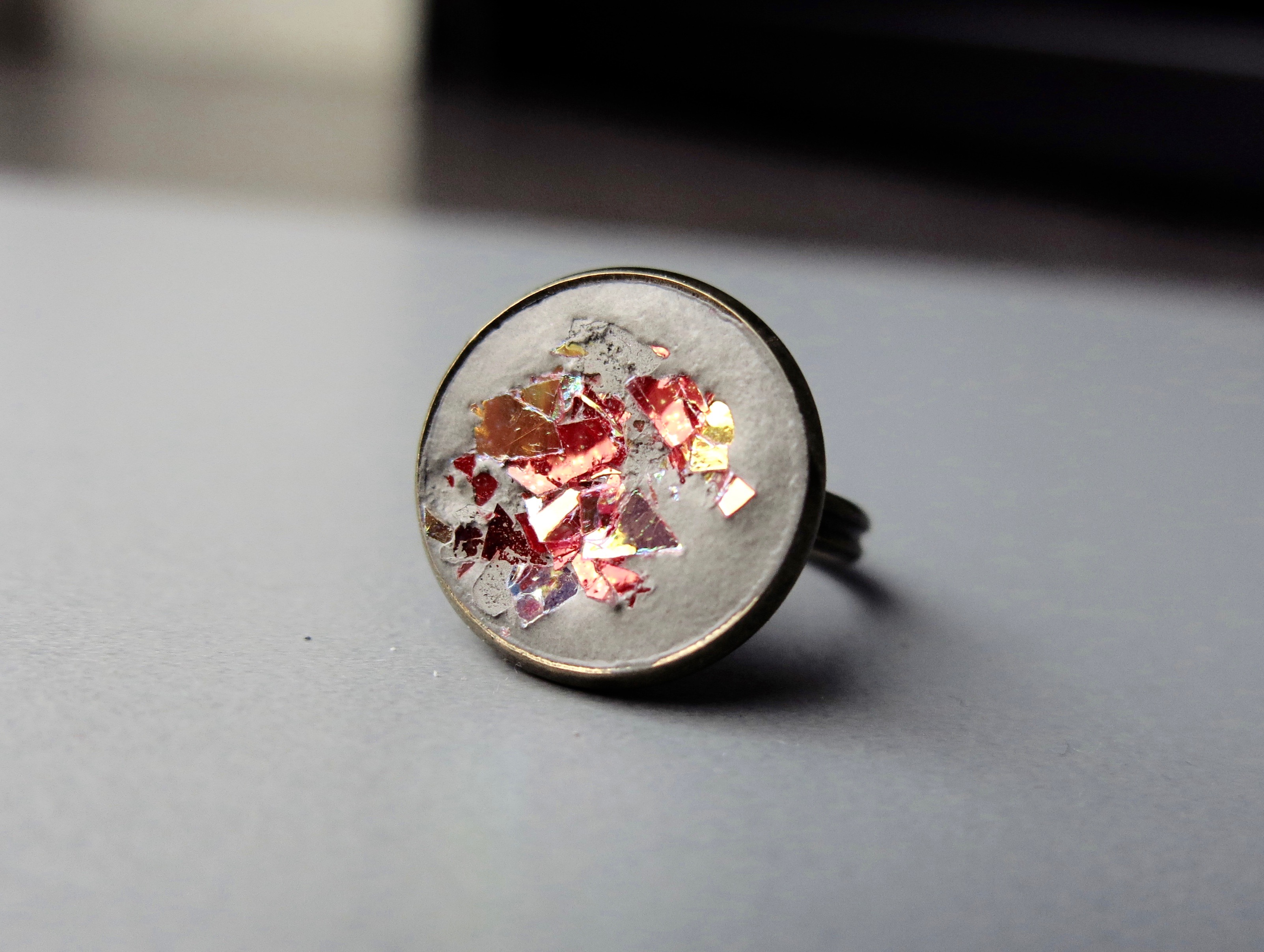 Fein von Hand in Beton gegossener Ring mit eingelassenen rotgoldigen Glitzer Flakes. Der Ring ist aus bronzefarbenen Messing und über eine hintere Ringschiene größenverstellbar.