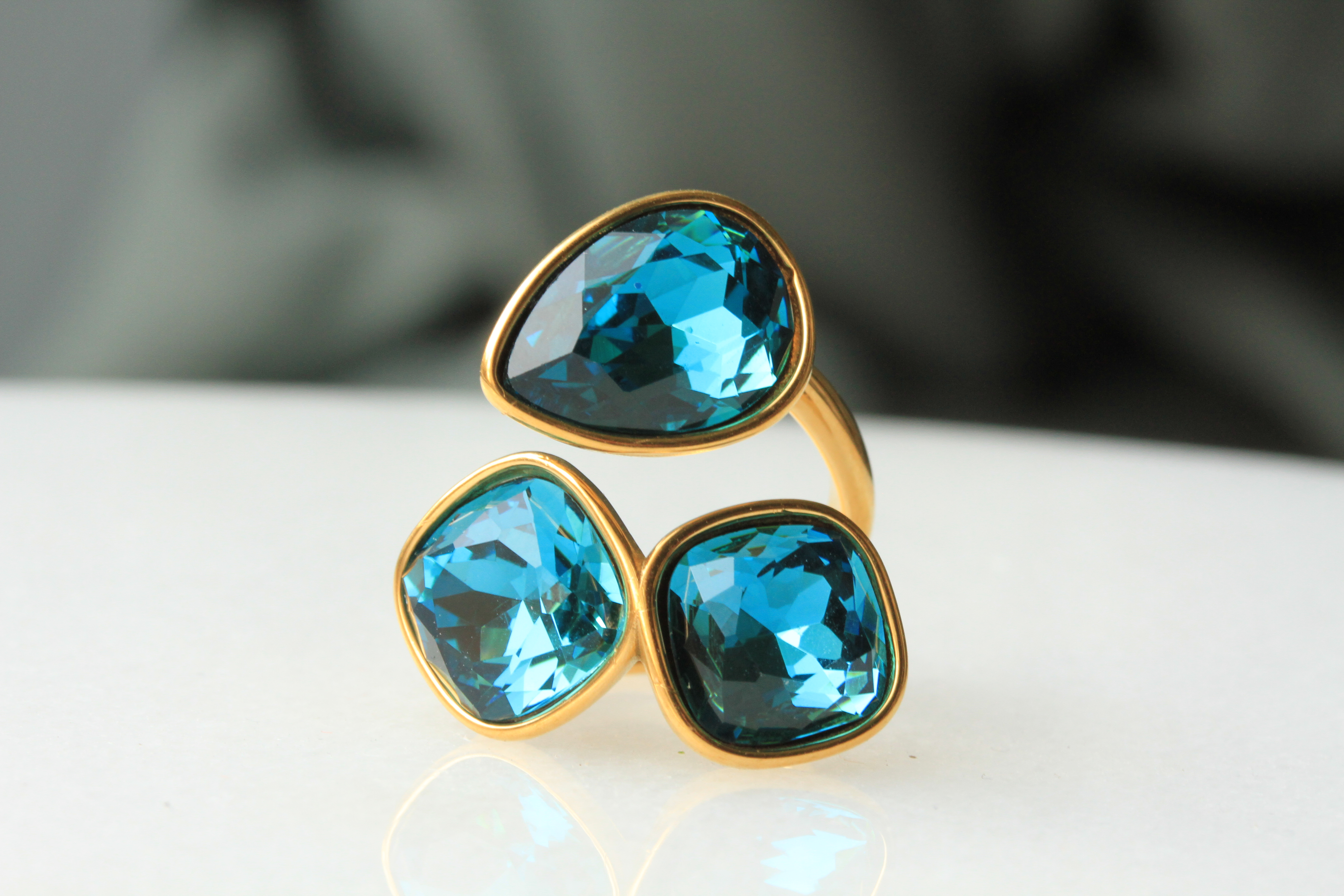 In einer schlichten Fassung aus vergoldetem Edelstahl, sitzen drei fein facettierte blaue Topase hydro in toller Qualität. Der blaue Stein harmoniert perfekt mit der Vergoldung und dieser Ring wird alle Blicke auf sich ziehen.