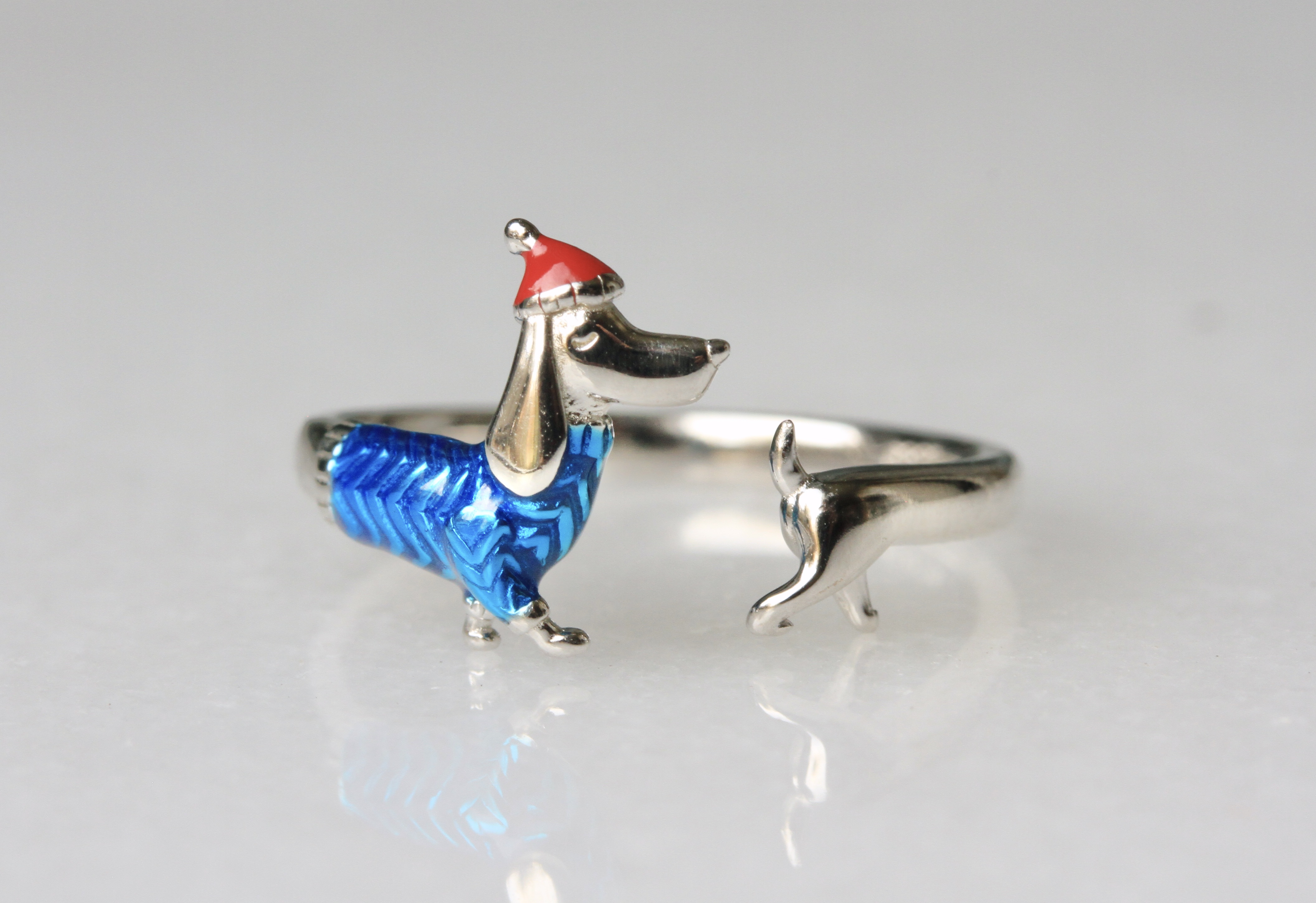 Sehr fein ausgearbeitete Ring aus Sterling Silber (925) mit einem kleinen dreidimensionalen Dackel. Er trägt einen blauen Pullover und eine kleine rote Weihnachtsmütze, fein emailliert.